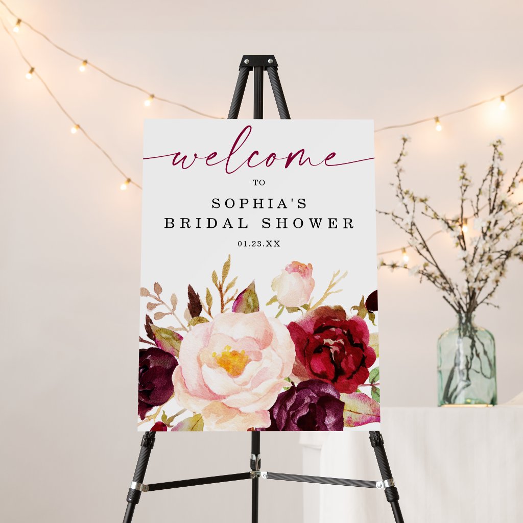 Boho Burgundy Floral Bridal Shower Welcome Sign