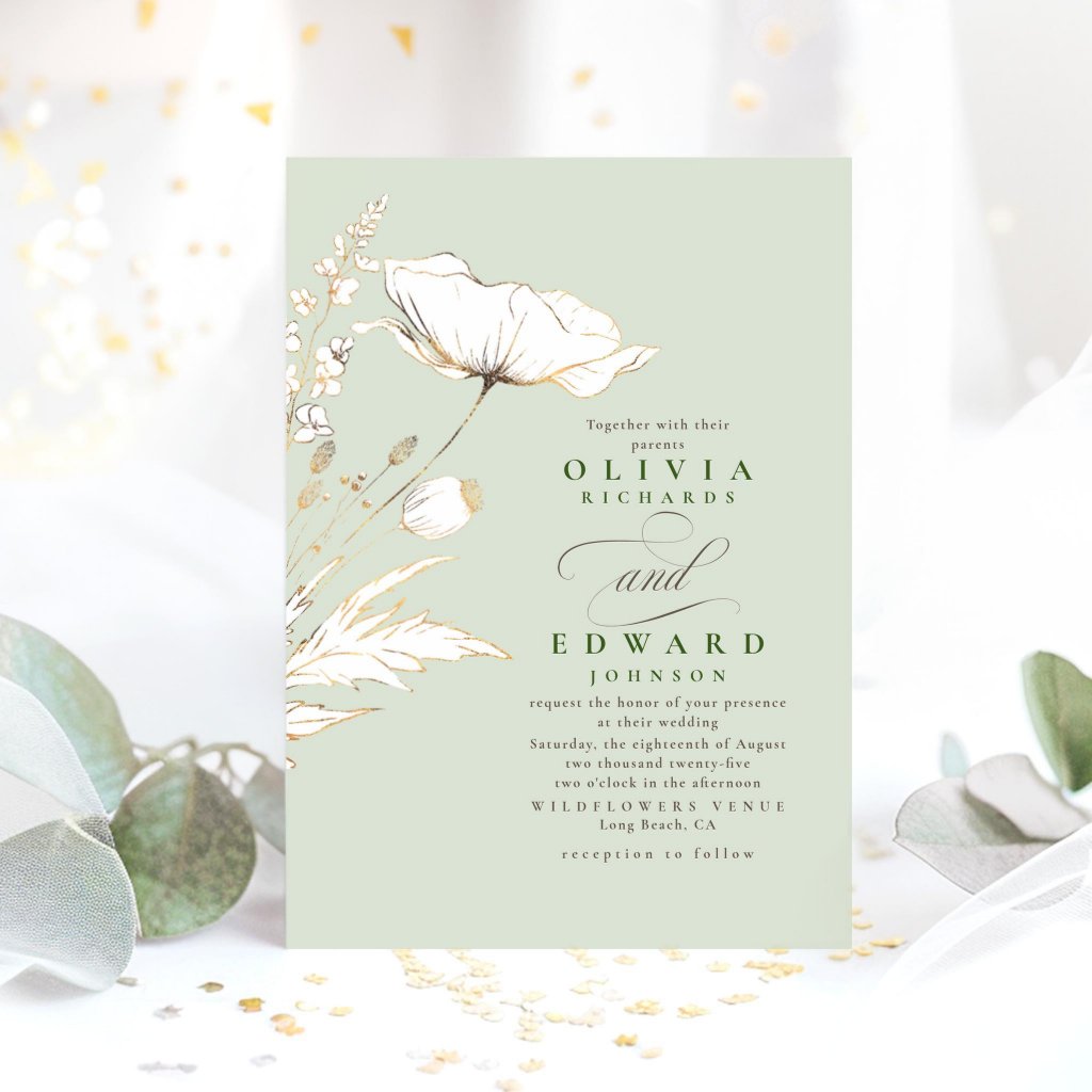 Faux Gold Foil Wildflowers Sage Green Botanical Wedding Invitations