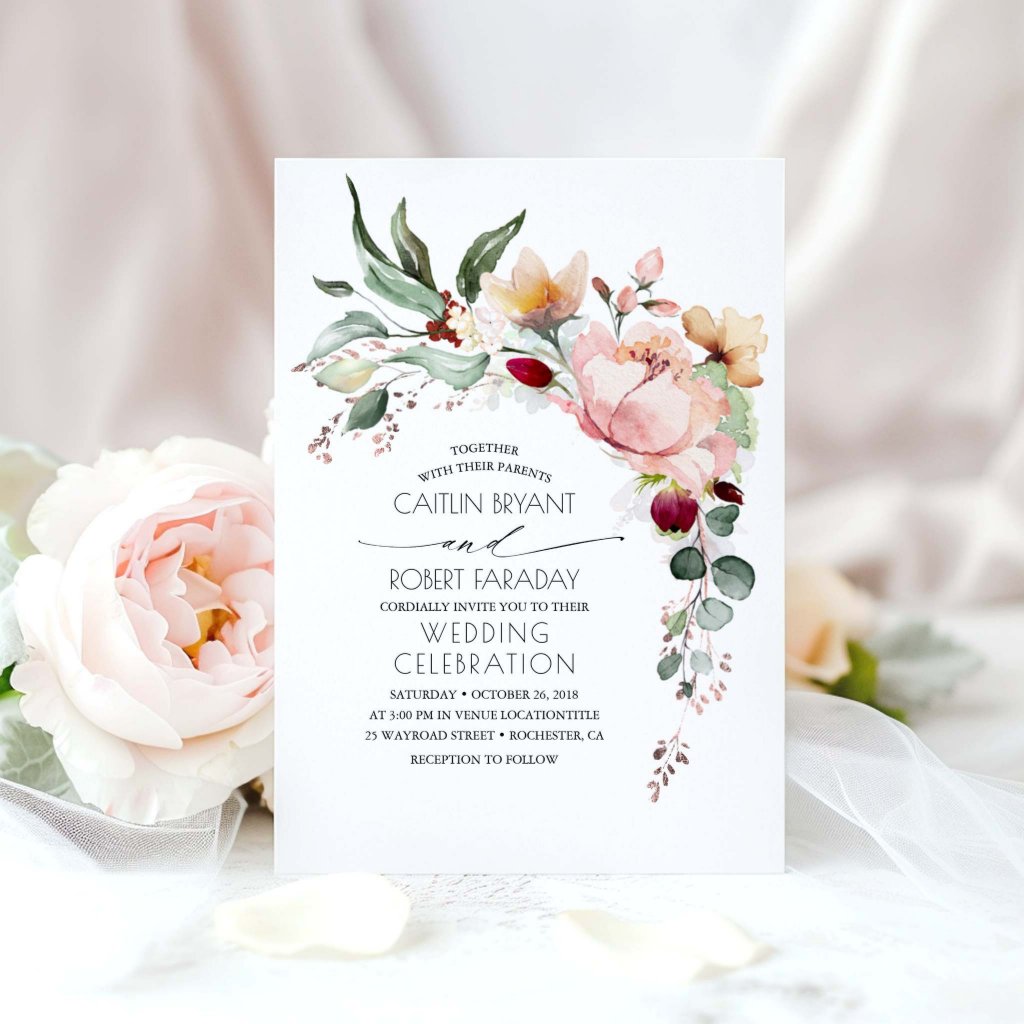 Elegant Modern Dusty Pink Rose Floral Watercolor Wedding Invitations