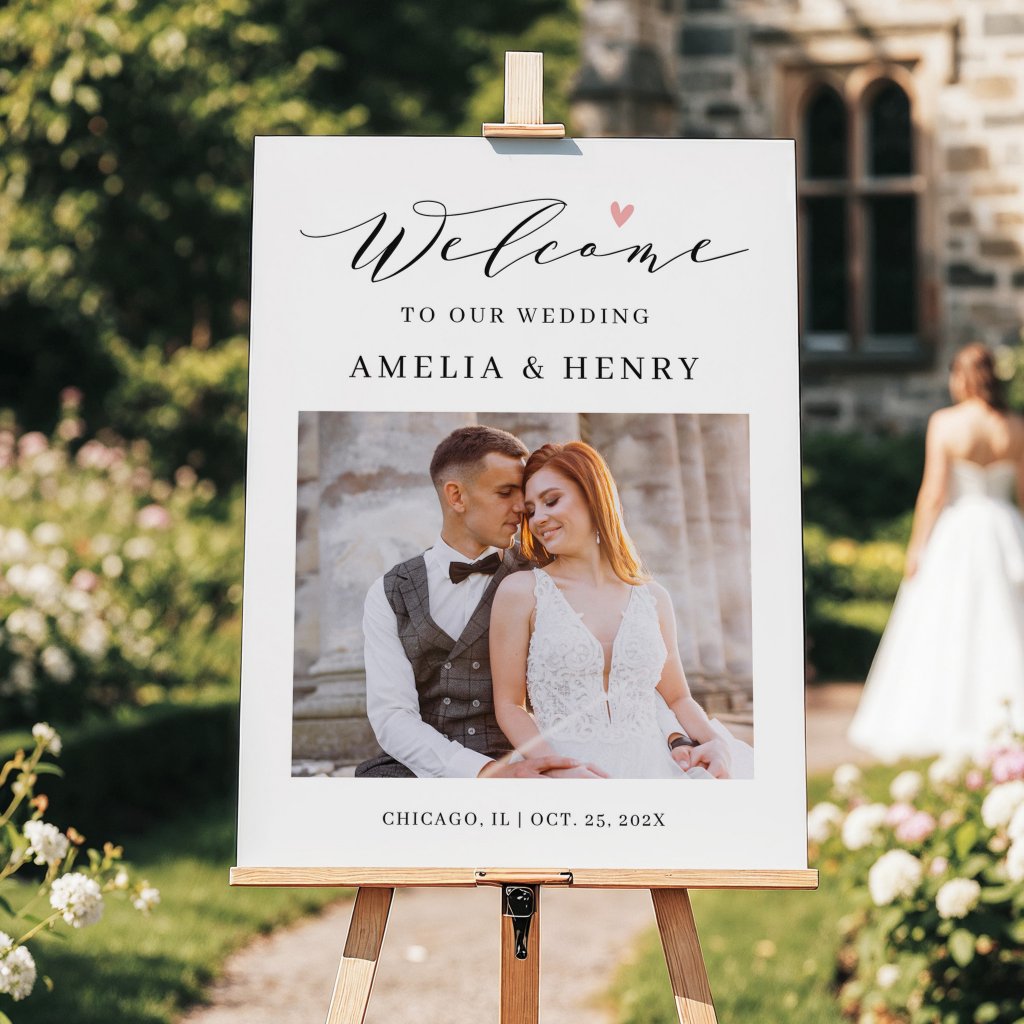 Shop elegant wedding welcome signs ready to edit online. Personalize with your event details and optional photo. Printable wedding signs are available for download or print and ship.